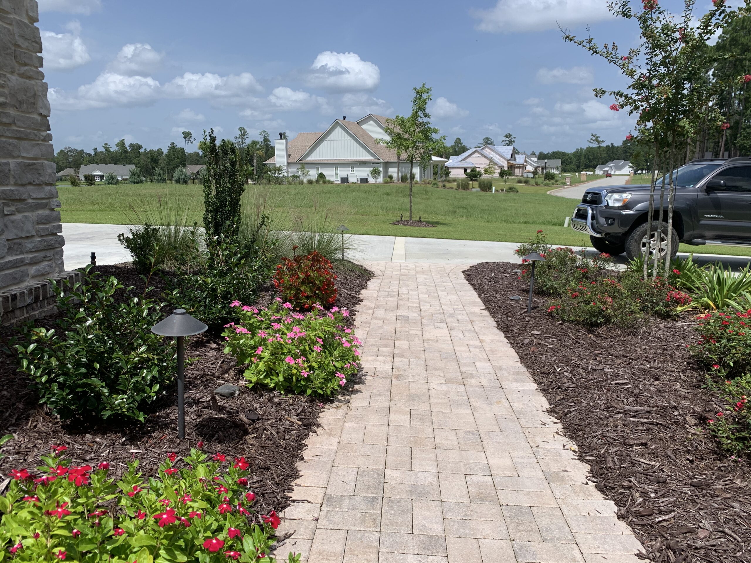Curb Appeal: We design welcoming entrances to your front door. We focus on proper width. Two people should be able to walk side-by-side. We use curves to ensure the walkway flows naturally with your property. This enhances the overall curb appeal of your home.